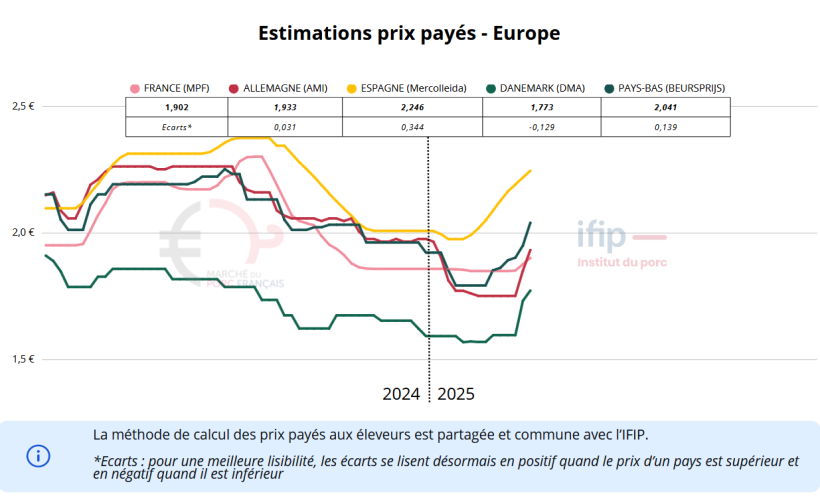 En Espagne, l’offre demeure inférieure à la demande, maintenant une dynamique haussière sur le marché. Le poids des animaux reste stable, tout en affichant un écart de 1,5 kg par rapport à 2024. L’activité d’abattage progresse régulièrement, reflet d’un marché dynamique. Le marché de la viande est également en hausse, même si les débouchés vers les pays tiers manquent toujours de vigueur. L’Espagne reste désormais sur une progression plus prudente dans l’intention de réduire son écart avec les autres pays européens.
