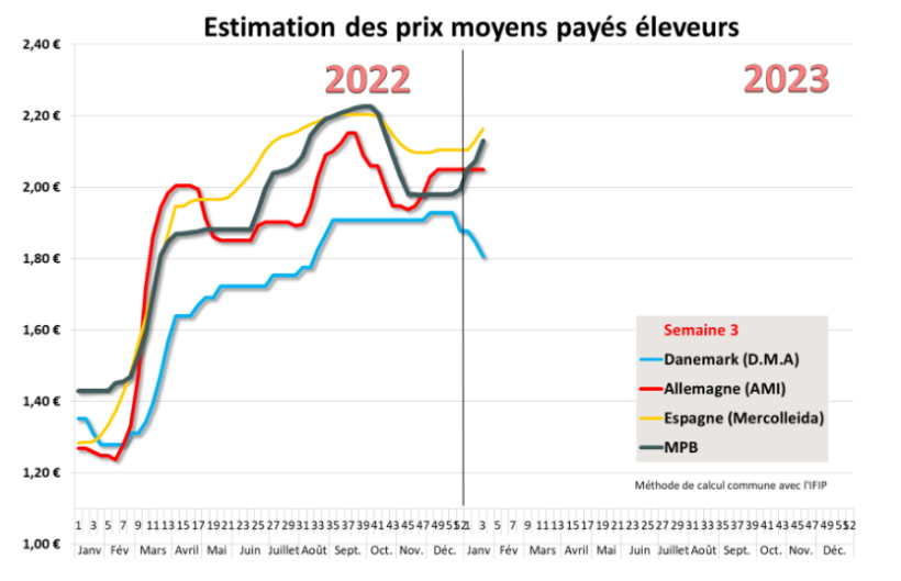 En Allemagne, les abattoirs appellent à la baisse du cours du porc mais en vain car le niveau des offres est très bas en ce début d’année. Pour les 2 premières semaines 2023, les abattages sont en repli de 11,25 % !