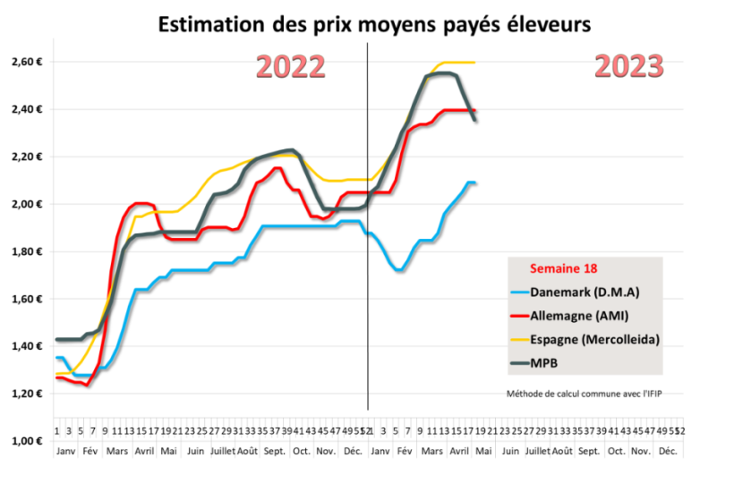 Deux nouvelles baisses maximum ont été enregistrées à l’issue des 2 ventes hebdomadaires, le cours s’établit en fin de semaine à 2,182 euros. En un mois, le cours a perdu près de 20 centimes d’euro après notamment 3 baisses maximum consécutives. Pour rappel, le prix du porc au MPB avait haussé de 55,9 centimes depuis le début de l’année sans connaître une seule baisse avant le 3 avril. Cette série de baisse du cours intervient alors que l’activité est réduite par la succession des 5 fériés de printemps dont 4 en mai. Si les offres ne sont pas excessives, le commerce reste morose comme c’est le cas partout en Europe. Les ventes plus laborieuses vers les pays tiers ramènent plus de viande sur le marché intra- communautaire ce qui exacerbe la concurrence entre les différents marchés en cette période d’inflation et de demande atone. L’activité de la semaine du 1 er mai s’est élevée à 308 842 porcs, les poids ont repris 113 grammes à 96,43 kilos.