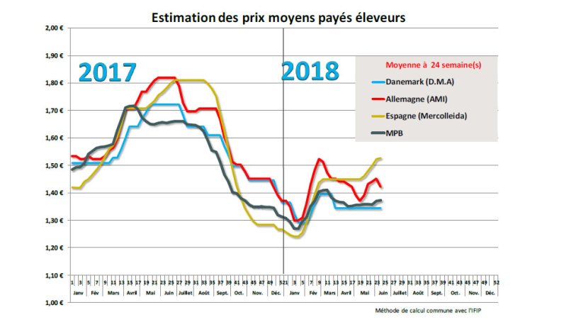 Ce contexte est général sur toutes les places de cotations européennes avec des tendances oscillant entre baisse des cours surtout au nord de l’Europe et stabilité relative dans le sud. La Belgique subit fortement l’influence allemande en abaissant son prix de 2 cents du kilo vif, contrairement à l’Autriche qui parvient à conserver son prix stable tandis que les offres autrichiennes se situent 10% en-dessous de la normale. Le prix d’acompte danois reste figé dans une inquiétante stabilité depuis 12 semaines.