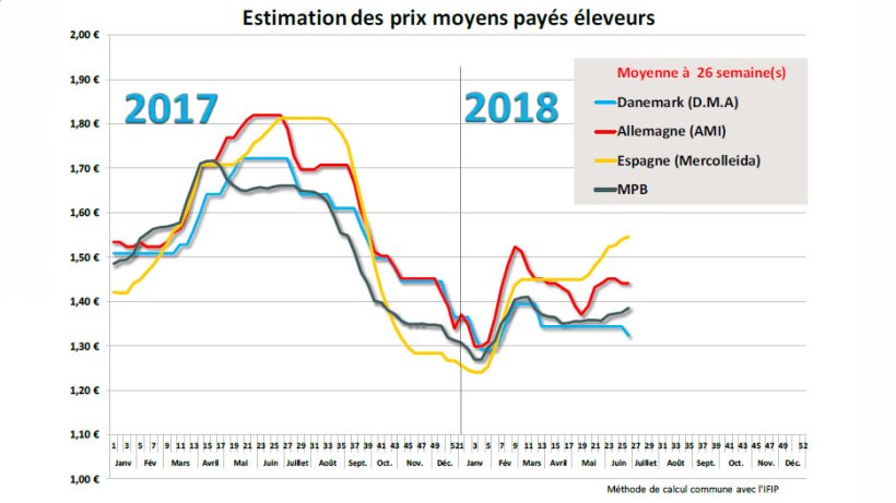 La baisse saisonnière des offres inverse le rapport offre / demande et permet aux vendeurs opérant au Marché du Porc Breton d’opposer un peu plus de résistance par le biais de la mise en invendus de certains lots. Les 3 000 porcs invendus à l’issue de la séance de jeudi n’ont malheureusement pas suffi à infléchir la volonté des acheteurs, bien décidés à contenir la hausse puisque le cours du jour n’a progressé que de 0,8 cent en fin de séance pour totaliser 1,1 cent dans la semaine. Au vu de la faiblesse des offres, la demande des abattoirs est bonne pour alimenter les points de vente pour cette fin de mois toujours ensoleillée et riche en événements sportifs. Certes, la fin de mois et le début de migration des populations à l’entrée de la période estivale ne sont pas forcément favorables aux achats des ménages, mais la France bénéficie d’un fort attrait touristique et la demande intérieure devrait se dynamiser à l’instar des pays du sud durant ces prochaines semaines dont les activités seront pleines jusqu’à la semaine du 15 août. L’activité d’Uniporc Ouest de la semaine passée a été de 368 886 pour des poids qui reculent encore de 350 g. Depuis un mois, la baisse totalise 1,6 kg, les poids moyens sont à présent sous les 94 kilos (93,9 kg) et proches des poids de la même semaine 2017 (93,95 kg). Sur le premier semestre 2018, la moyenne des poids Uniporc Ouest est de 95,51 kg, 500 g audessus des poids moyens 2017. Durant cette même période, les abattages 2018 sont environ 2% supérieurs à ceux de 2017 sur la base des mêmes critères (nombre de jour et abattoir). Quant au prix moyen, il se situe à 1,182 euro de moyenne sur les 6 premiers mois de l’année, 18% inférieur à la même référence 2017 (1,443 euro, - 26,1 centimes).