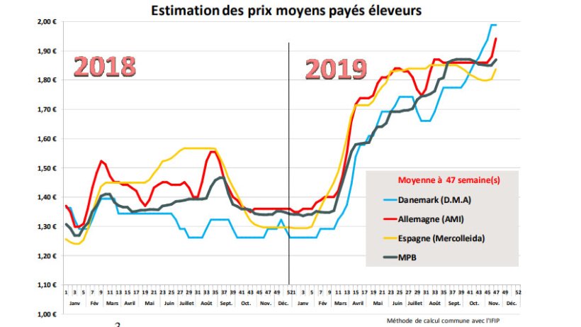 Les reports d’enlèvement liés aux 2 récents fériés de début novembre restent importants pour certains groupements et cette situation a transparu au cours de la vente de lundi où plus de 800 porcs n’ont reçu aucune enchère, ont été affectés et bénéficient d’une journée supplémentaire pour être enlevés sans risque de pénalité de retard pour les outils. Le cours est resté identique à celui des 4 séances précédentes. La vente du jeudi 21 novembre s’est déroulée tout autrement : si l’option de la stabilité du cours avait pu être choisie pour certains outils, ça n’a pas été le cas pour tous et pour s’assurer leur approvisionnement, l’ensemble des abattoirs a progressivement suivi l’évolution des enchères haussières pour un consensus autour de 1,700 €, actant une hausse de 1,9 centime. Plus de 1 000 porcs n’ont cependant pas reçu d’enchère au cours de la vente et ont été affectés à certains abattoirs. Cette hausse du prix du porc s’inscrit dans un contexte européen majoritairement haussier avec une demande exceptionnellement élevée pour cette période de l’année. L’activité sur la zone Uniporc Ouest la semaine dernière s’est élevée à 392 790 porcs abattus, à nouveau une des meilleures activités de l’année 2019. Comme partout ailleurs, les outils tournent au maximum des capacités avant une baisse de la demande à la mi-décembre. Pour autant, les poids moyens ne baissent pas comme souvent dans le cas d’une forte activité : ils reprennent à nouveau 200 g à 96,83 kg. Cette situation correspond plutôt à une volonté de la part des éleveurs de livrer des porcs plus lourds au prix du porc actuel sans trop de risque de dégradation de la plusvalue.
