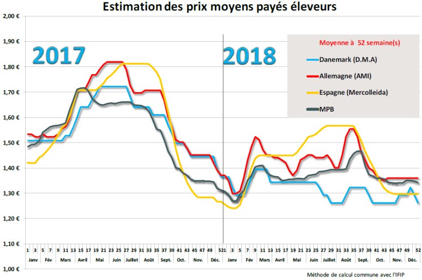 Certaines places de cotations européennes étaient fermées cette dernière semaine de l’année, le 25 et 26 décembre étant fériés dans de nombreux pays. Cela a été le cas en Allemagne où par conséquent, la référence officielle est reconduite pour la 11ème semaine consécutive. Par effet de ricochet, les prix belge, danois, hollandais, autrichien sont restés stables aussi. La référence espagnole est, elle aussi, reconduite au cours d’une semaine où l’activité est réduite à 2 jours et demi d’abattage. Les stocks sur pied grossissent partout et probablement que, dès la fin de la semaine de Noël, le rythme de l’activité va s’accélérer. Le bilan annuel fait apparaître un cours français 5 à 6 cents inférieur aux cours allemand et espagnol, la référence française se positionnant une grande partie de l’année sous les 2 références concurrentes. De plus, l’absence de la reprise estivale traditionnelle a fortement pénalisé le cours français, suscitant colère et déception des éleveurs. L’année 2019 débutera sur des bases de prix assez proches du début 2018, c’est le cas en Allemagne tandis que le prix espagnol repart sur un niveau légèrement supérieur, c’est aussi le cas en France.