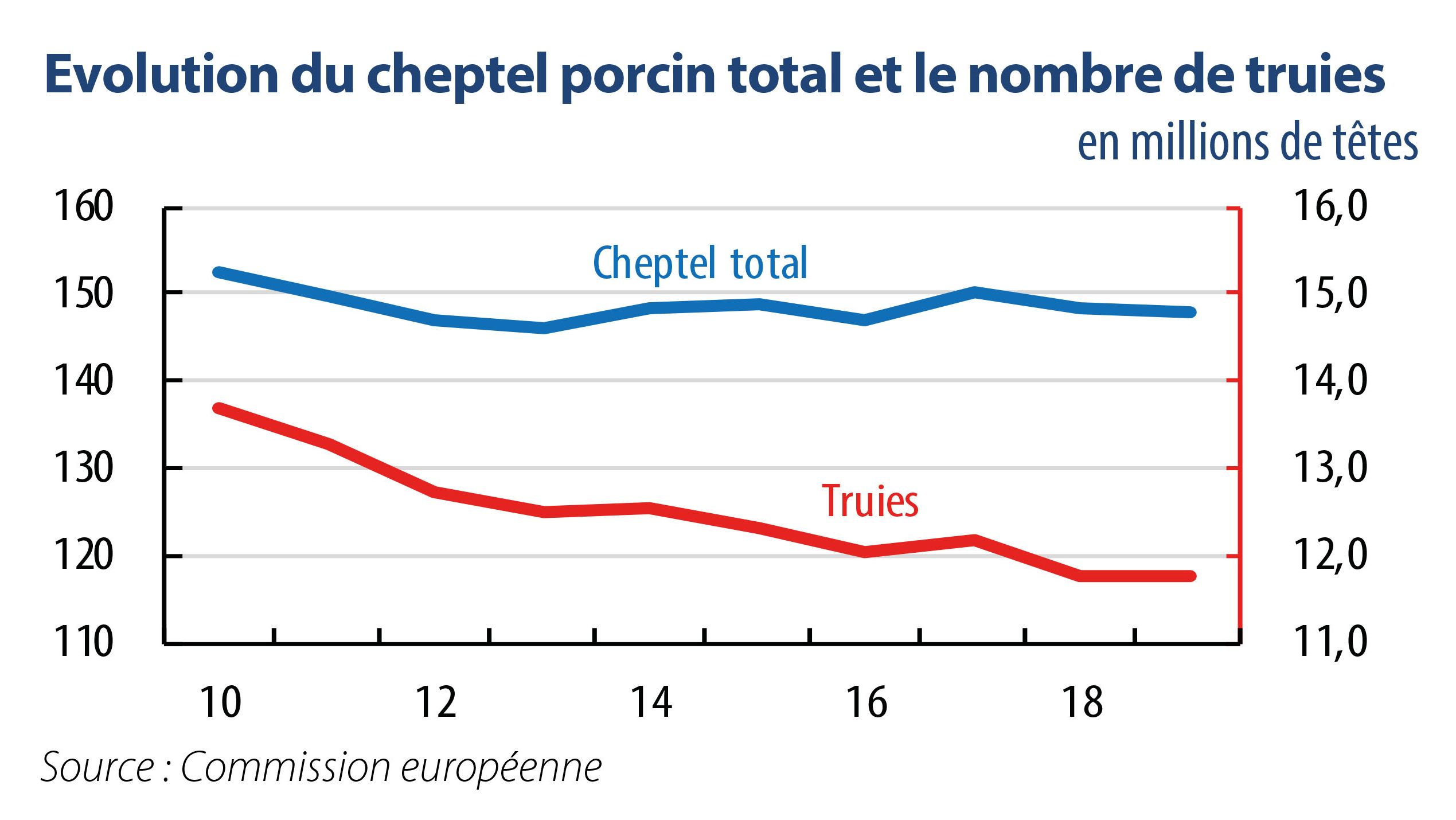 En 2019, la production porcine européenne devrait se stabiliser. Une consommation intérieure baissière dans l’UE à 28 et une forte demande des pays tiers devraient tirer le prix du porc à la hausse.