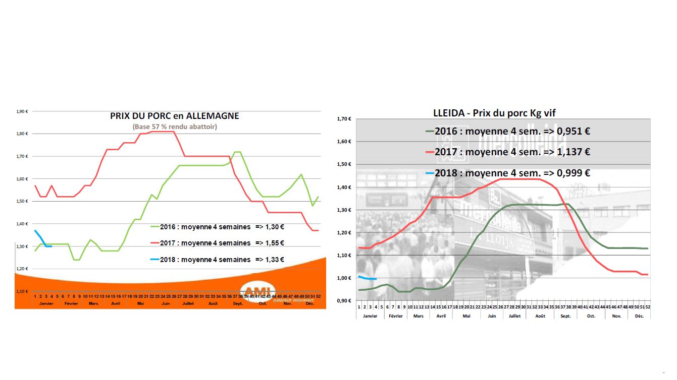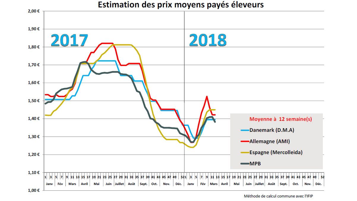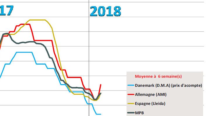 En Europe, si l’on observe les courbes des prix payés éleveurs, on constate que la baisse allemande a positionné le cours espagnol dans les prix hauts de l’échiquier européen.
