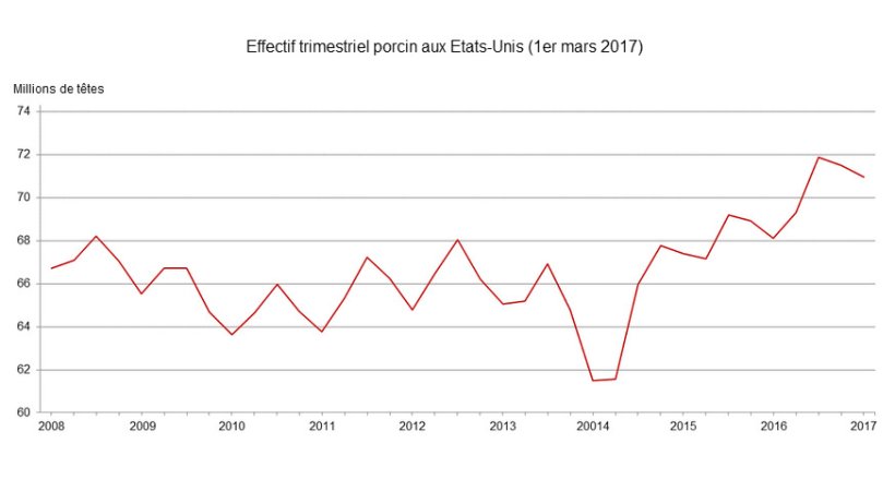 Au 1er mars on comptait 71,0 millions de têtes porcines aux Etats-Unis, soit 4% de plus qu'en mars 2016, mais 1% de moins en comparaison avec les données du trimestre précédent (1er décembre 2016), selon le rapport trimestriel publié par le Service des Statistiques Agricoles (NASS) de l'USDA. Sur le total, 6,07 millions de têtes sont des reproducteurs.