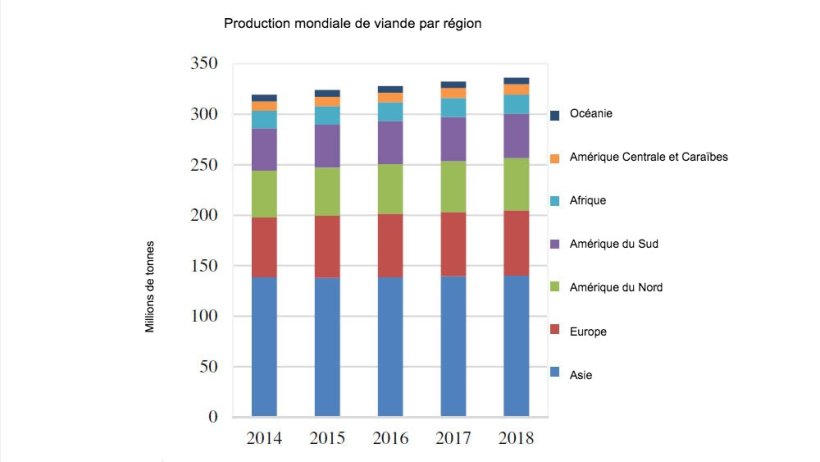 Selon les données de la FAO, la production mondiale de viande en 2018 est estimée à 336,4 millions de tonnes, soit 1,2% de plus qu'en 2017, principalement à partir des États-Unis, de l'Union Européenne et de la Fédération de Russie. mais compensée partiellement par une baisse de la Chine et la stagnation du Brésil, deux des plus gros producteurs de viande au monde.