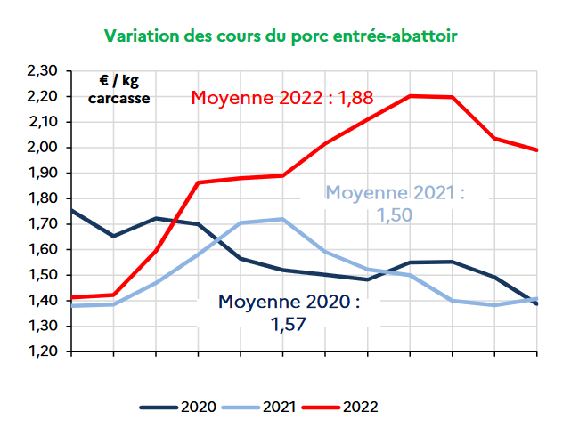 Les cotations du porc ont été, ces dernières années, en lien direct avec les évolutions de la demande (et d’abord celles des importations chinoises). Mais en 2022, c’est l’offre (ou le manque d’offre) qui devient le facteur prédominant. Face à la baisse des volumes disponibles, le prix moyen du porc classe E+S s’est établi à 1,88 €/kg, soit une hausse de 38 centimes/kg par rapport à 2021 (+ 25,3 %). Alors que les cotations connaissent d’ordinaire un net reflux en fin d’année, en 2022 elles faiblissent quelque peu mais restent cependant à un niveau élevé, qui témoigne des tensions affectant le marché. Cette forte progression du prix du porc en 2022 (+ 25 %) s’est traduite par une augmentation de sa part dans le prix de vente au consommateur pour tous les produits suivis par l’Observatoire.