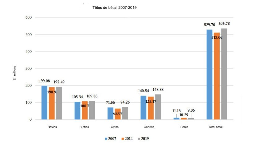 Le cheptel total indien s'élevait à 535,78 millions, soit une augmentation de 4,6% par rapport à l’effectif précédent de 2012. Cependant, l’effectif porcin a connu une diminution de plus de 12,0%, portant le total de têtes de porcs à 9,06 millions. Les porcs ne représentent que 1,7% du cheptel total en Inde.