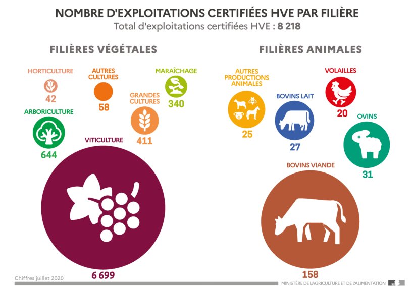 Le nombre d'exploitations certifiées de Haute Valeur Environnementale a fortement progressé en seulement six mois : on compte 8 218 exploitations certifiées au 1er juillet 2020 contre 5 399 exploitations au 1er janvier dernier, soit une augmentation de 52% sur les six premiers mois de l’année 2020). Au-delà de la filière viticole, précurseur en la matière, les filières de l'arboriculture, du maraîchage, de l'horticulture et des grandes cultures ont continué leur engagement dans le dispositif.