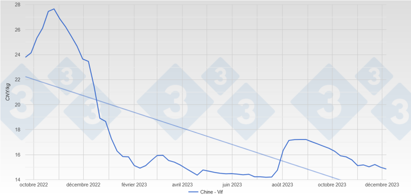 En novembre, l'indice des prix à la consommation (IPC) a baissé de 0,5% sur un an et de 0,5% sur un mois. Les prix du porc ont baissé de 31,8 %, selon le Bureau national des statistiques de Chine.