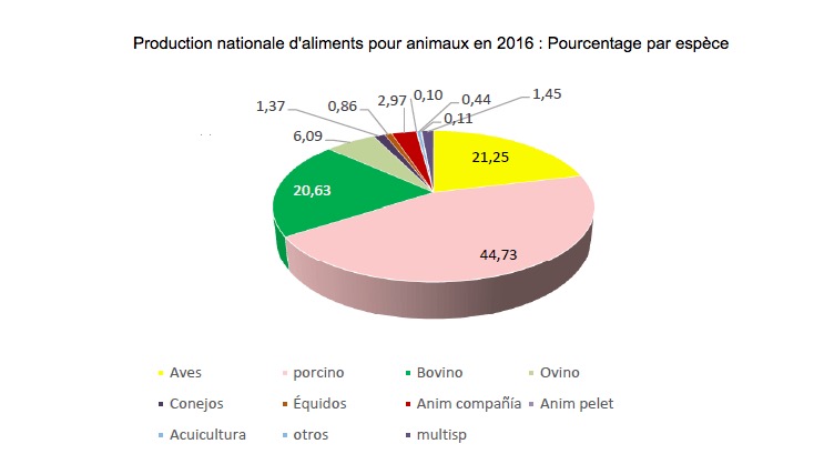 Selon les estimations de production de FEFAC pour l'année 2016, dans un document actualisé au mois de juin 2017, l'Espagne a été le deuxième producteur d'aliments pour animaux de l'UE, avec une hausse de 1,6% par rapport à 2015, après l'Allemagne (baisse de 0,1% par rapport à 2015), la France passant à la troisième place (baisse de 3,4% par rapport à 2015).