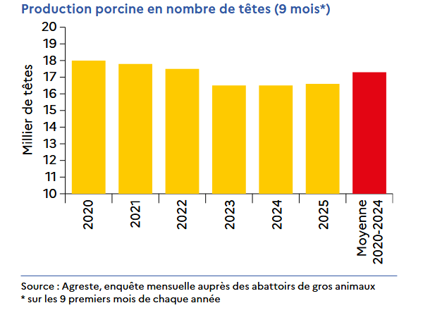 Selon le Bilan conjoncturel 2025, publié par Agreste, de janvier à septembre de 2025 la production porcine en France atteint 16,6 millions de têtes, marquant une légère reprise de 0,5 % par rapport à l’année précédente. Cependant, elle reste en deçà de 3,9 % par rapport à la moyenne des années 2020-2024, principalement en raison de la contraction du cheptel de truies.