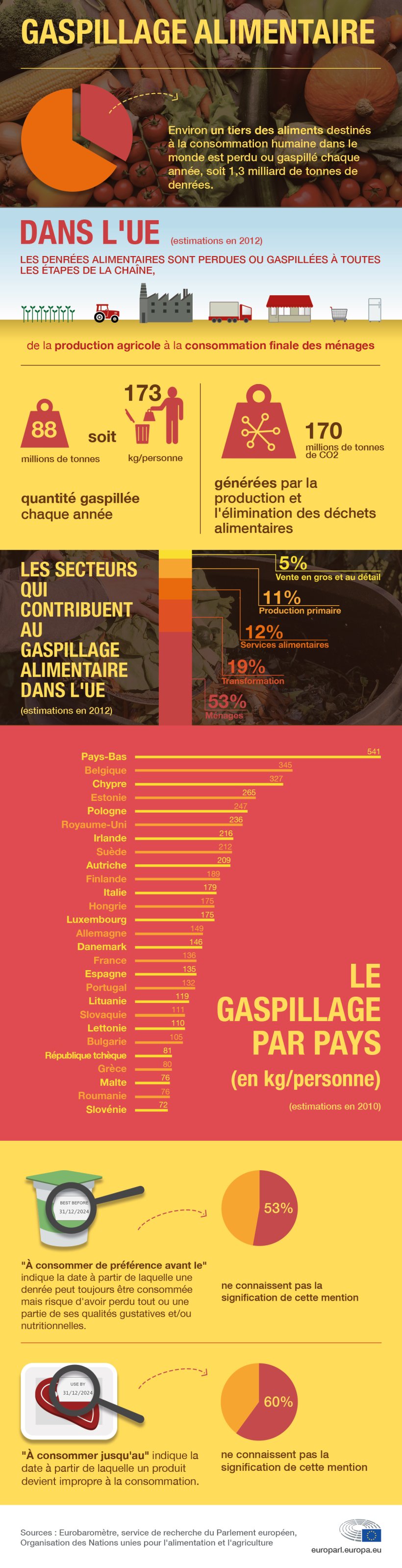 Dans l’UE, le gaspillage alimentaire représente 88 millions de tonnes, soit 173 kg par habitant et par an. La production et l’élimination de ces déchets alimentaires conduisent à l’émission de 170 millions de tonnes de CO2 et à la consommation de 26 millions de tonnes de ressources.