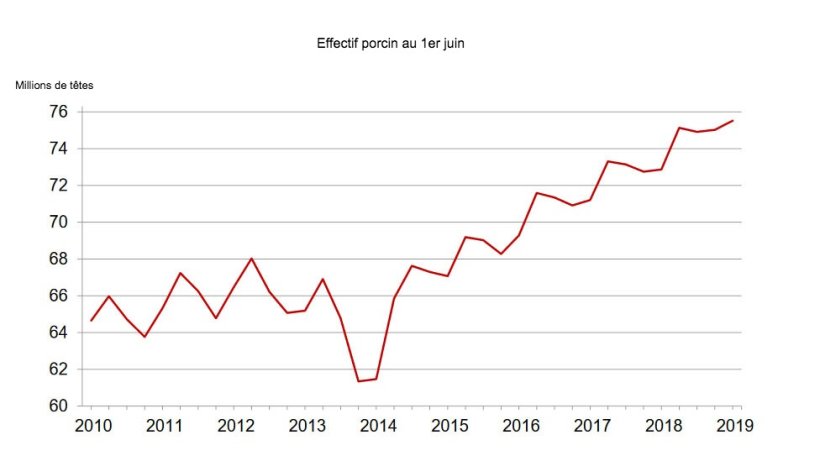 - Sur les 75,5 millions de têtes, 69,1 millions sont des porcs de marché, tandis que 6,41 millions sont des reproducteurs.