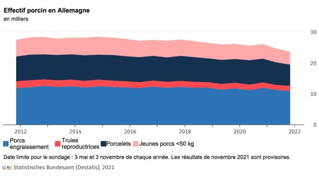 En novembre 2021, on a dénombré en Rhénanie-du-Nord-Westphalie 366.000 porcs de moins qu'en mai 2021, et dans le Bade-Wurtemberg, environ 181.000 porcs de moins qu'en novembre 2020.