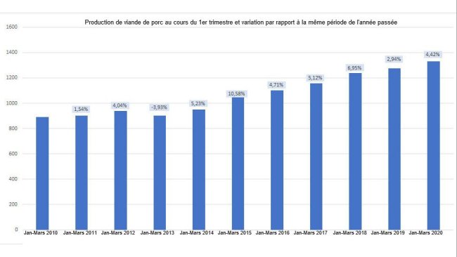 Au cours du premier trimestre de cette année, l'Espagne a produit 1.329.943 tonnes de viande de porc, soit une augmentation de 4,42 % par rapport à la même période l'année dernière.
