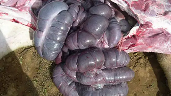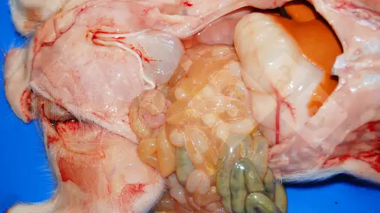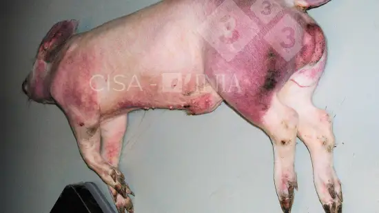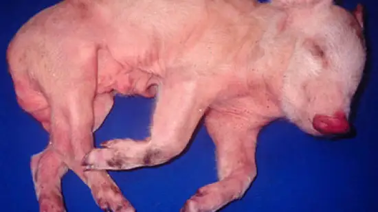 Plusieurs porcelets sevrés présentent des signes cliniques de diarrhée et une perte de poids à partir de l’âge de 8 semaines. À la nécropsie, on observe une diarrhée mucohémorragique ainsi qu’une hypertrophie des plaques de Peyer de la muqueuse intestinal