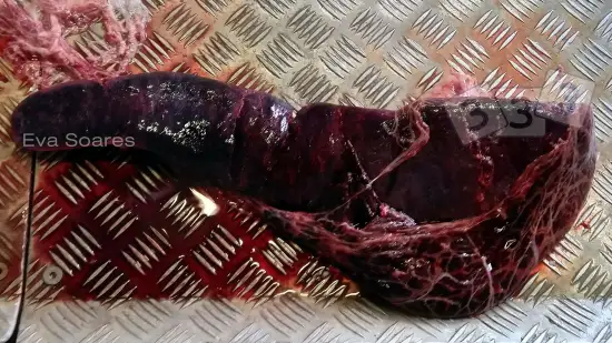 Cette image en coupe transversale d'un poumon de porc est caractéristique d'une pneumonie provoquée par: