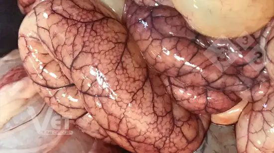 Quelle pourrait être la cause de ces changements inflammatoires dans les intestins d'un porc charcutier ?