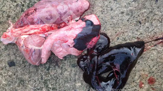 Un porc d'engraissement apparaît mort dans la case. La seule lésion trouvée à l'autopsie est une congestion du lobe pulmonaire diaphragmatique gauche avec un caillot sanguin dans la cavité thoracique. Quelle est la cause de cette lésion ?