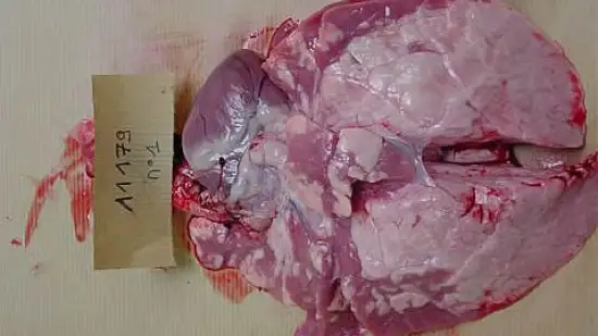 A quoi vous fait penser cette lésion du poumon avec des zones d'hépatisation sur les lobes cardiaques et apicaux sur un porcelet de 5 semaines présentant de la toux ?