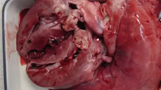 Cette lésion visible dans ce coeur ouvert à l'autopsie correspond à: