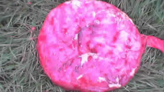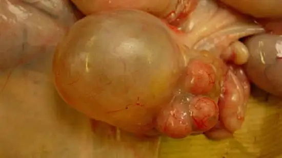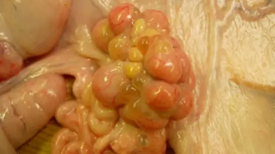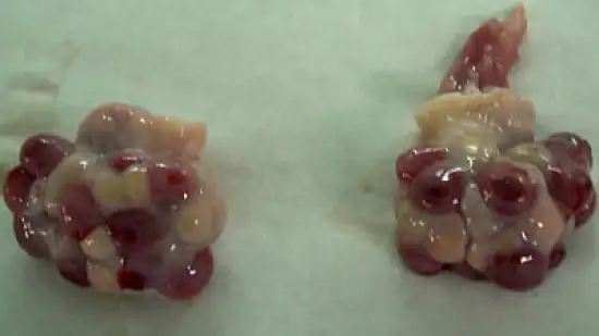 Les masses rouges (d’environ 1cm de diamètre) que l’on voit sur ces 2 ovaires d’une truie sont :