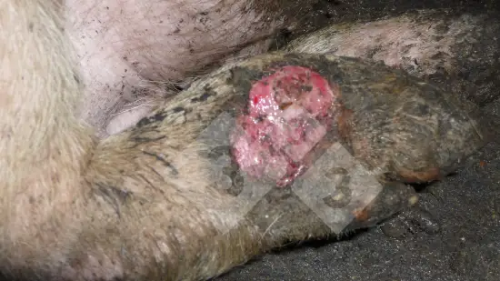 Plusieurs porcs en phase de finition ont une pododermite ulcéreuse sur la partie externe des membres, ce qui entraîne des boiteries. A quoi est due cette lésion?