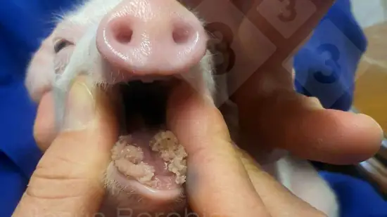 Nous observons des masses irrégulières et grumeleuses sur la muqueuse buccale de la lèvre inférieure d'un porcelet de deux semaines. Quelle est la cause la plus probable de cette lésion ?
