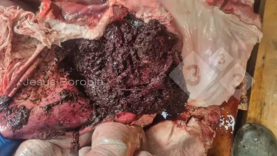 Cette truie en mauvais état, anémique, a été retrouvée morte dans sa case. L'estomac contenait un contenu noir foncé. Quelle est la cause la plus probable de cette lésion ?