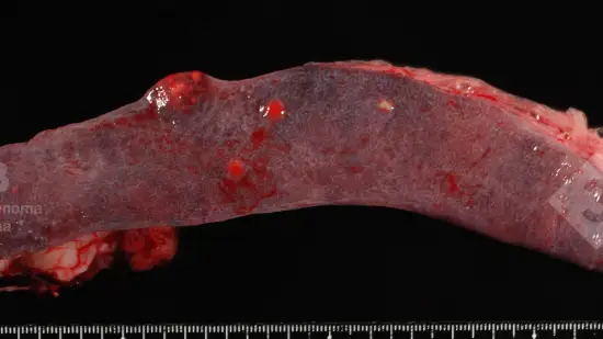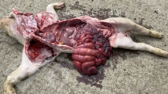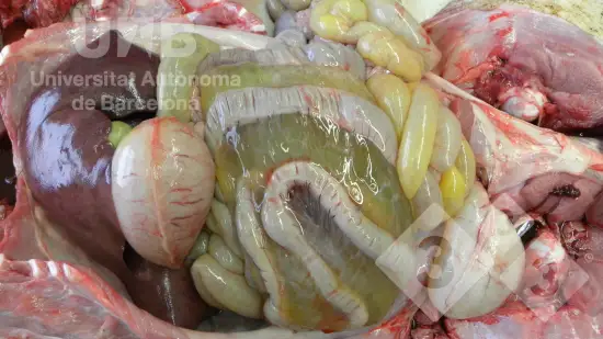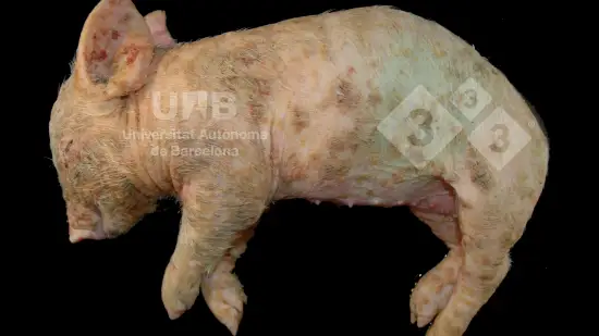Plusieurs porcelets sevrés présentent des signes cliniques de diarrhée et une perte de poids à partir de l’âge de 8 semaines. À la nécropsie, on observe une diarrhée mucohémorragique ainsi qu’une hypertrophie des plaques de Peyer de la muqueuse intestinal