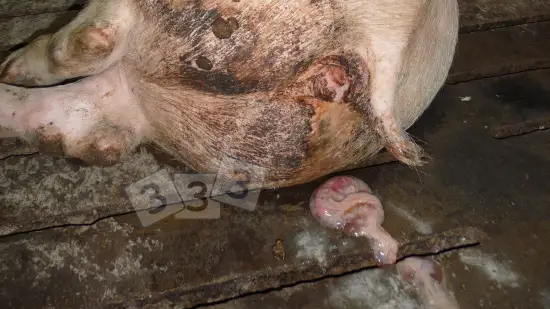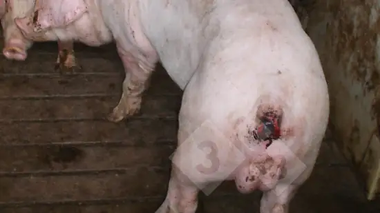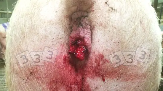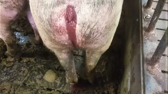 Cette truie a une masse qui dépasse par derrière. Quelle est la cause la plus probable?