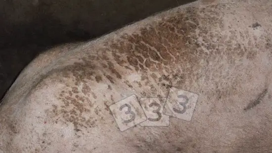 Quelle peut être la cause de ces grandes squames brunes sur la peau du dos de cette truie ?