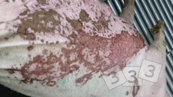 Un lot de porcs arrive à l'abattoir avec des lésions cutanées autour de la zone périnéale et de la partie inférieure du corps. Quelle est la cause de cette lésion?