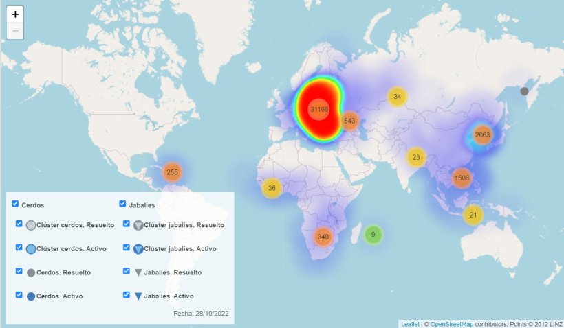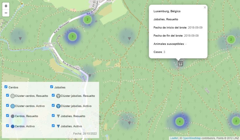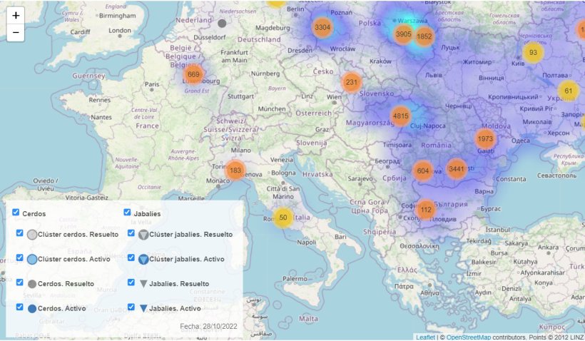 À partir de la légende de la carte, tu pourras afficher ou masquer les cas chez les sangliers ou les porcs, en choisissant entre les cas isolés ou les clusters, et entre foyers actifs ou terminés. Tu pourras ainsi trouver les foyers sur la carte en te permettant de masquer les foyers que tu ne cherches pas.