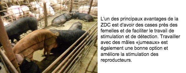 Une deuxième question concerne l'option d'avoir une zone de détection de chaleur (ZDC), zone spécifique où concentrer le travail de stimulation de la venue en chaleur, où se trouvent les mâles souffleurs et où, une fois les truies inséminées, elles passent dans les cages d'insémination-contrôle. Une autre option consiste à sevrer et inséminer dans les cages d'insémination-contrôle où les truies resteront pendant le premier mois de gestation.