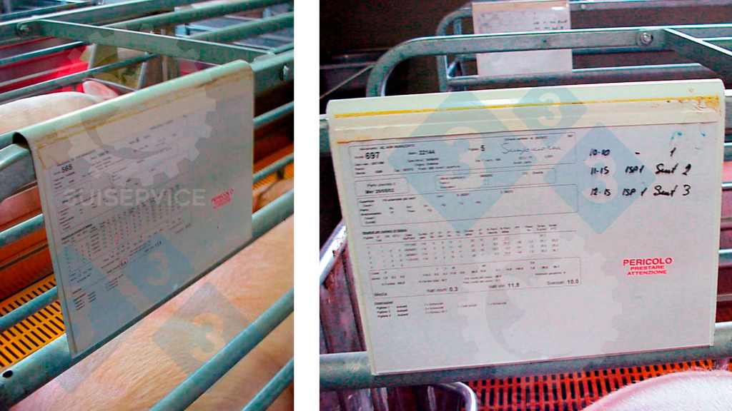 Quand nous avons imprimé le dossier de la truie qui ira à la salle de mise bas, avec toutes ses données (peut-être dans l'après-midi, calmement) nous nous arrêtons pour le lire, nous évaluons son caractère, si elle est nerveuse, si elle a eu des mort-nés, si elle a l'habitude d'écraser ses petits, etc... Et si nous pensons que cette truie a besoin de plus d'attention au moment de la mise bas, nous ajoutons au dossier un grand texte en rouge qui appelle notre attention au mois de la mise bas. "Vous pouvez être sûr", dit Agostino, l'inventeur de ce tampon, "que lorsque vous verrez le rouge, vous prêterez davantage attention à cette truie".