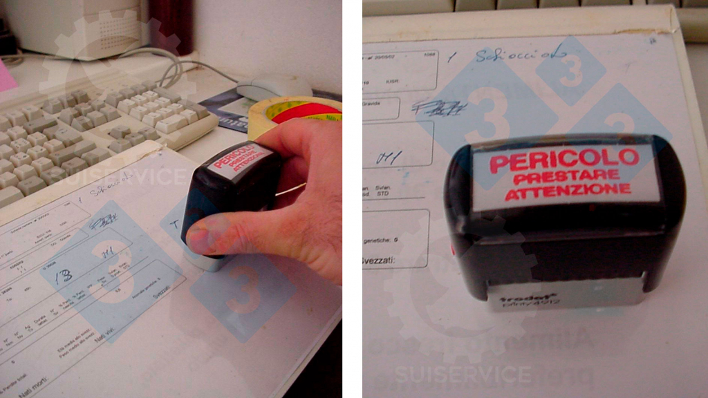 C'est le tampon qu'Agostino a fait préparer : DANGER, ATTENTION ! , qu'il appose sur les dossiers des truies qu'il considère " à risque ".