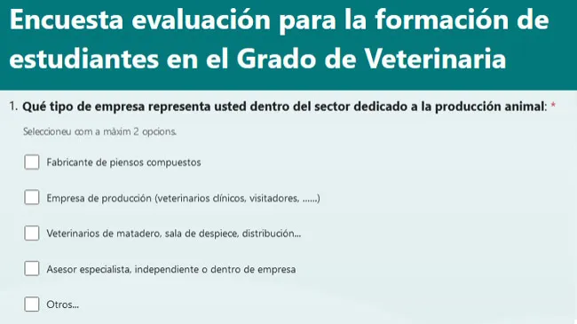 La presente encuesta está destinada a profesionales del sector de la producción animal (veterinarios de campo, empresas de producción, fabricantes de pienso, etc) y diseñada para evaluar las necesidades en términos de formación, conocimiento y competencias técnicas básicas para futuros profesionales estudiantes del Grado de Veterinaria.