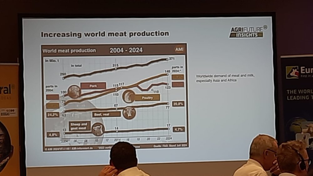La presentación ha abordado las principales preocupaciones del sector: la guerra de Ucrania y el cambio climático, con la consiguiente volatilidad en el mercado de las materias primas, el debate social sobre la agricultura, la presión legislativa, las enfermedades, como la PPA, o la creciente demanda en sostenibilidad. Comenta que la situación del sector agro-ganadero en general es, pese a todo, mejor que su estado de ánimo, especialmente en porcino. Ha presentado datos del sector, como la evolución de la producción mundial de carne, donde destaca el crecimiento del pollo por encima de las otras especies.