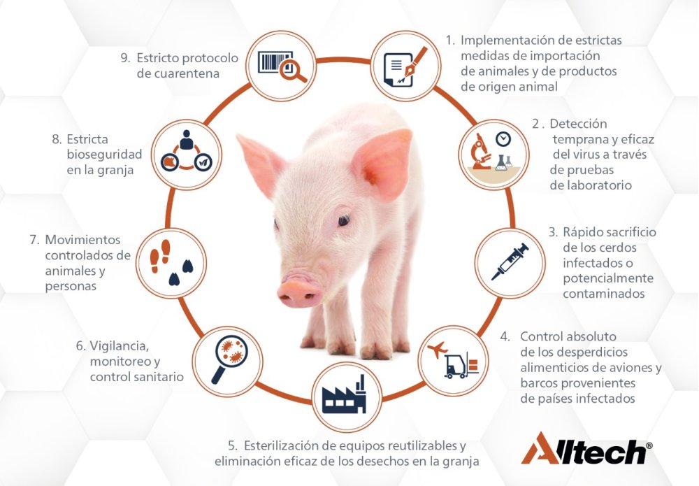9. Estricto protocolo de cuarentena: Se deben aplicar estrictas medidas de cuarentena tanto en las zonas libres de PPA, como en las zonas infectadas; para evitar la entrada de la enfermedad y/o evitar que la PPA se propague aún más.