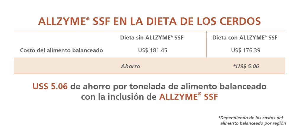 Con este proceso se obtiene una matriz enzimática compleja que facilita a los nutricionistas un grado de flexibilidad en la formulación de las dietas y la liberación de más nutrientes para el cerdo; lo que significa un ahorro de costos para el productor. El Gráfico 2 presenta una dieta de finalización a la que se incluyó la tecnología de Allzyme® SSF de Alltech, para mejorar la digestibilidad y reducir los costos por tonelada de alimento balanceado. Es un caso que representa una ración común en los estados de Ohio e Indiana de los Estados Unidos.