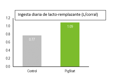 Figura 1: Mejora de la ingesta diaria de lacto-reemplazante debida a la implementación del concepto PigStart en lechones desde el día 3 al 28 de edad. (Estudios realizados por Biochem 2020)