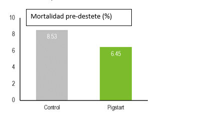 Figura 2: Reducción de la mortalidad al pre-destete debido a la implementación del concepto PigStart en el lacto-remplazante en lechones de 3 a 28 días de edad. (Estudios realizados por Biochem 2020)