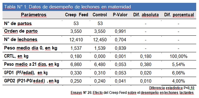 Desde el punto de vista técnico, la diferencia encontrada entre los lechones alimenta- dos, en comparación a los lechones no alimentados, fue de 380 gramos más por animal al momento del destete. Esto nos indica que estos animales más pesados al destete (grupo Creep Feed) serán 1,90 y 5,13 kg más pesados a los 70 y 153 días de vida respectivamente según datos obtenidos en ensayos realizados en el Centro de Investigación Biofarma S.A. (REPORTE DE ENSAYO N° 18 – BIOFARMA S.A.).