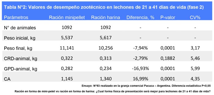 Podemos concluir que el uso de alimentos en forma de minipellet desde los 21a 41 días de vida permite mejorar el desempeño zootécnico y consecuentemente el beneficio económico de los animales.