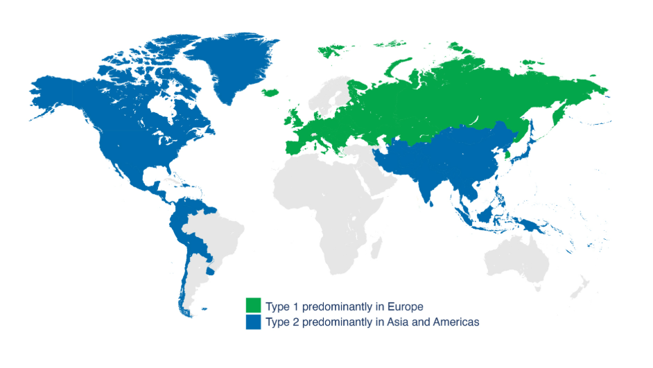 Both types were discovered around 1990: type 1 viruses in Europe and type 2 viruses in North America. Although the origin of PRRSV is not known, the extensive differences between type 1 and 2 PRRSVs suggest that their ancestors evolved geographically independently.