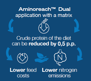 Aminoreach™ Dual is a unique combination of fermentation products and phytogenics, designed to optimize protein and amino acids digestion in pigs without compromising animal performance and allowing to lower the feed costs.