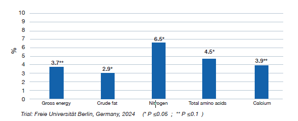 Aminoreach™ Dual significantly improved the apparent ileal digestibility of crude fat (+2.9%) and nitrogen (+6.5%), whereas there is a tendency for positive response on gross energy and calcium.